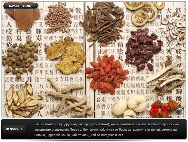 Листата от коприва съшо намират приложение при артрит. Тяхно свойство е да спрат възпалителните процеси. Нони и екстрактът от дива череша също са изключително полезни. Куркума от своя страна съдържа куркумин, който има противовъзпалителни свойства.