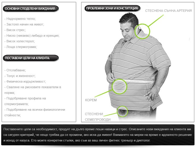 Всеки мой клиент попълва своя анкетна карта. Това е клиентското досие, чиято информация ми се предоставя по е-мейл (т.е. по електронен път), за да започна черновите на моите насоки. От прочетеното попълнената анкетна карта, с която съставям менюто на хранене и тренировъчната фитнес програма (дори и избора си на билки и продукти за здраве), обърнах внимание и на други важни детайла, около индивидуализирането на програмите: