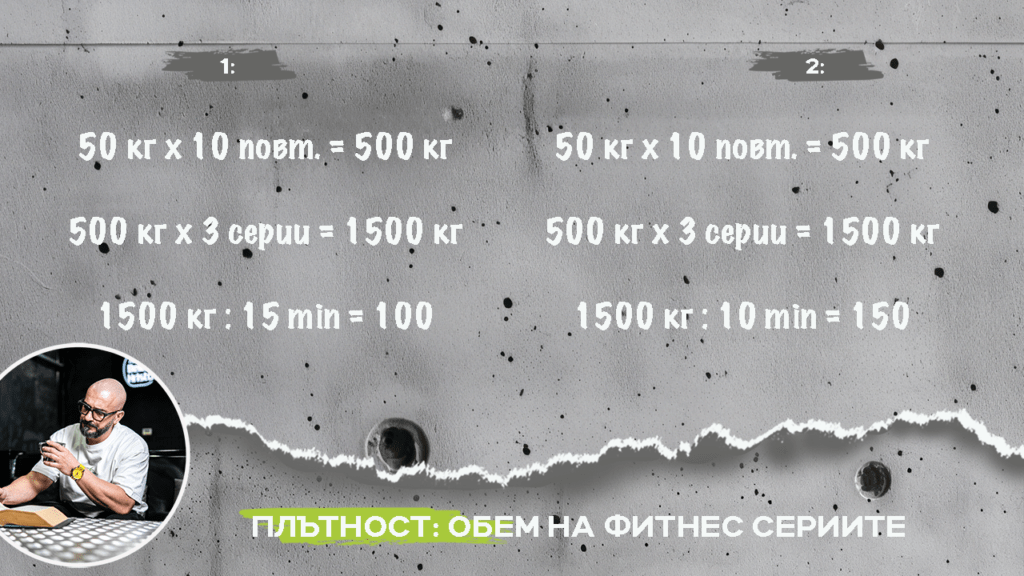 Тази бърза сметка, която можете да направите и вие показва и обяснява, че плътността е равна на съпротивлението, умножено по повторенията, умножено по работните серии и разделено на времето.