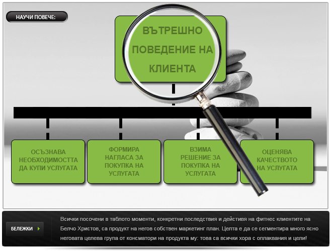Клиентът може и изживява най-различни свои “вътрешни“ състояния, преди да стигне до решението да закупи дадена фитнес услуга от мен. Аз трябва да съм този, който да вникне и разбере какво е това, което протича в мислите на клинета ми – не от физиологична гледна точка, а от изцяло психологическа. Това го правя, като събирам информация от всички “външни“ символи на неговото поведение.