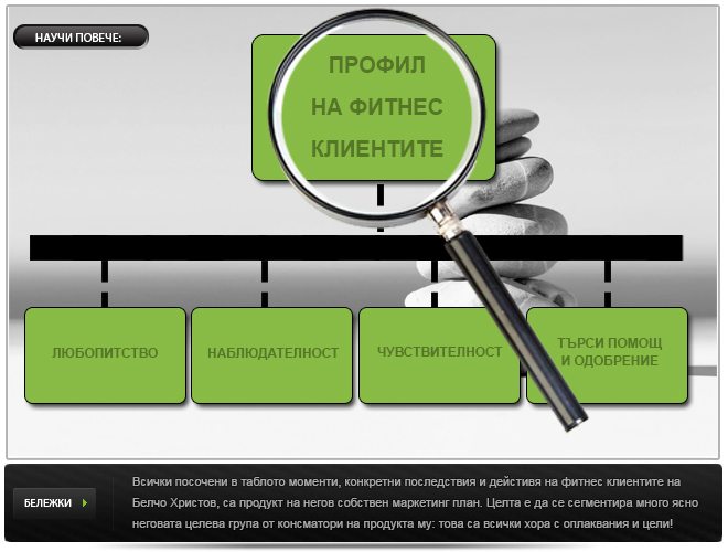Това е да се запозная с любопитните страни на фитнес клинетите, с които съм работил, работя и ще работя за в бъдеще. Всичко това ми помага в т. нар. “разбиране на клиента“ и е коренно различно от прибързаното съждение за него. А това ми помага да усвоя по-успешен начин за комуникация с “Него“.