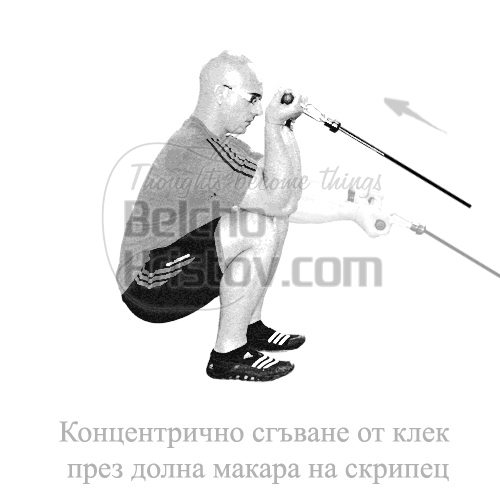 за гръб изпълнявайте придърпване на скрипец (пулдаун) пред гърди