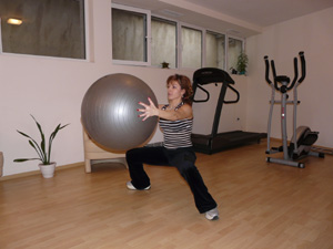 Хванете от двете страни Швейцарската топка! Разкрачът ви трябва да е следния: петите трябва да са на по-голямо разстояние от ширината на рамената ви. А пръстите на краката широко настрани. Бавно спускайте целият торс надолу, докато задната част на бедрата ви не стане в положение успоредно на пода. Задръжте така леко за секунда и плавно и с издишване се изправете. Не разгъвайте в колянната става напълно – първо, това не е добре за ставите ви, и второ – така ще държите бедрените мускули под непрекъснато напрежение, докато трае работната серия.