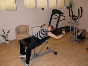 Изпълнението на това движение е следното: oбърнете облегалката на лежанката под прав ъгъл. Лакътната кост трябва да е успоредна на пода, а раменната перпендикулярна. С издишване избутайте гиричките нагоре, над главата. Обърнете внимание, на малката “арка”, която трябва да се образува – така не “заключвате” раменната става и давате още малко амплитуда на движението. Бавно спускате със поемане на въздух.