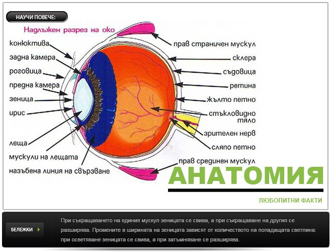 Ето какво знам за окото и неговата анатомия, споделям ви: окото има ябълковидна форма. То е изградено от три слоя – външен, среден и вътрешен. Външният слой включва плътната и прозрачната роговица, която се разполага в предния край на очната ябълка. Средният слой е съдовата обвивка на окото. Изграден е от голям брой кръвоносни съдове. В предния му край се намира ирис– дисковидно образование с отвор в средата. През този отвор, наречен зеница, светлината навлиза във вътрешността на очната ябълка. Широчината й може да се променя с помощта на два мускула, разположени в ириса.