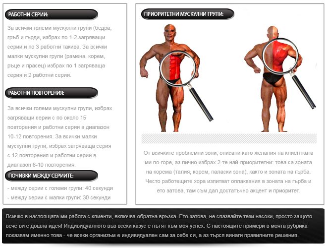 През месец трети и четвърти, вече когато ненужните грубо 5-6 килограма бяха свалени и клиентката ми се харесваше повече и повече, преминах към акцент подобряване на изоставащите мускулни групи и групите с приоритет.