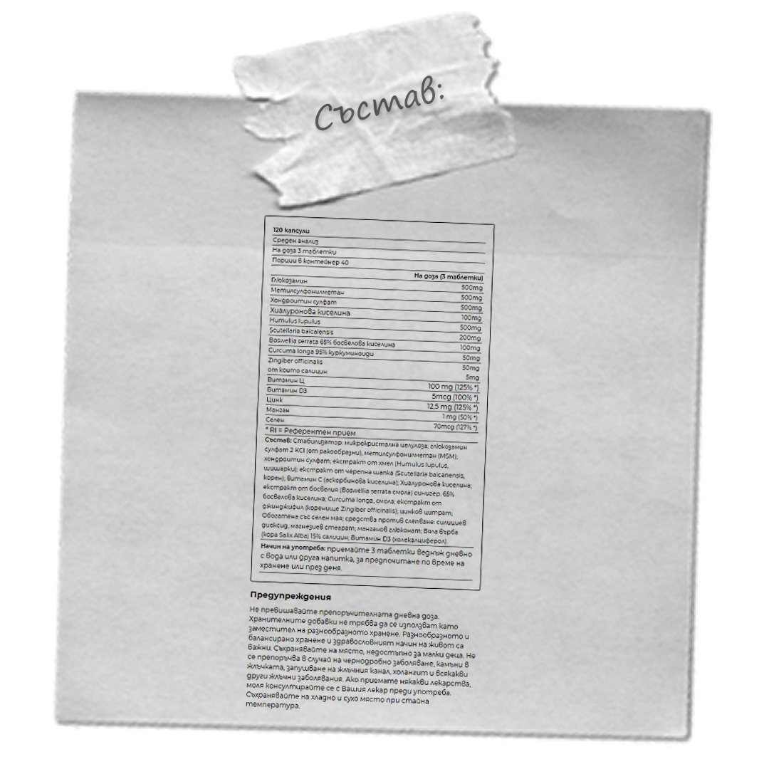 | ДЕТАЙЛЕН СЪСТАВ И СЪПЪТСТВАЩИ СЪСЪАВКИ: Стабилизатор: микрокристална целулоза; глюкозамин сулфат 2 KCl (от ракообразни), метилсулфонилметан (MSM); хондроитин сулфат; екстракт от хмел (Humulus lupulus, шишарки); е кстракт от шлемник (Scutellaria baicanensis, корен); витамин С (аскорбинова киселина); Хиал уронова киселина; екстракт от босвелия (Boswellia serrata resin) тит. 65% босвелиева киселина; Curcuma longa, смола; екстракт от джинджиф ил (Zingiber officinalis rhizome); цинков цитрат; Обогатена със селен мая; антислепващи агенти: силициев диоксид, магнезиев стеара т; манганов глюконат; Бяла върба (Salix Alba Bark) 15% салицин; Витамин D3 (холекалциферол). |